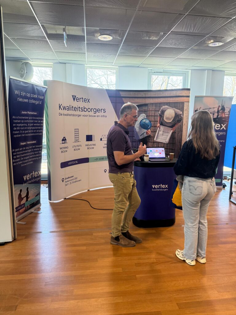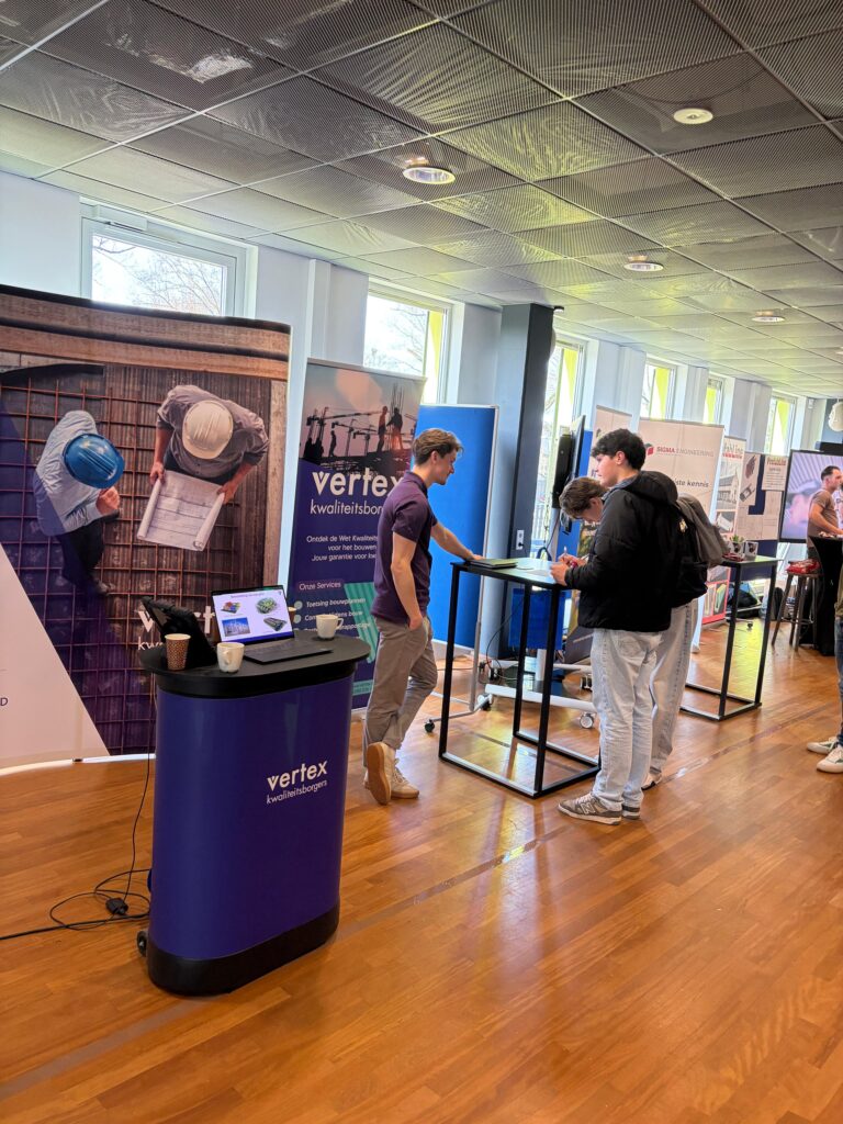 We hebben leuke gesprekken gevoerd, vragen beantwoord en een aantal studenten kunnen inspireren met ons verhaal en onze ervaringen uit de praktijk. Geïnteresseerd? Kijk eens naar onze vacature trainee bouwplantoetser op www.vertex.nl!